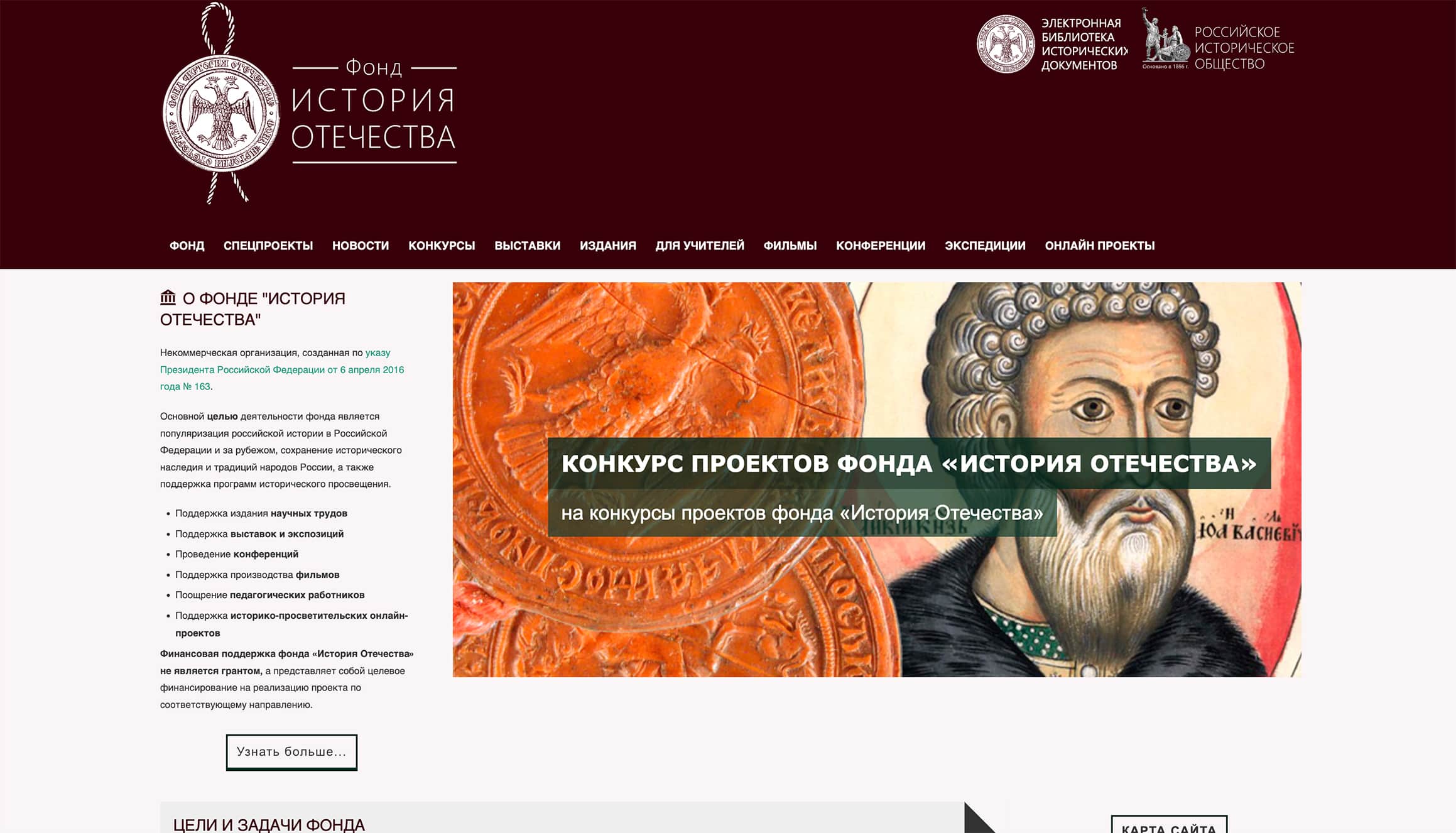 После создания сайта для Российского исторического общества в формате единой экосистемы был разработан сайт для фонда "История Отечества". Основной задачей сайта фонда стала публикация отчетов о проделанной работе и поддерживаемых фондом проектов, а также обьявление конкурсов грантов и новостей.