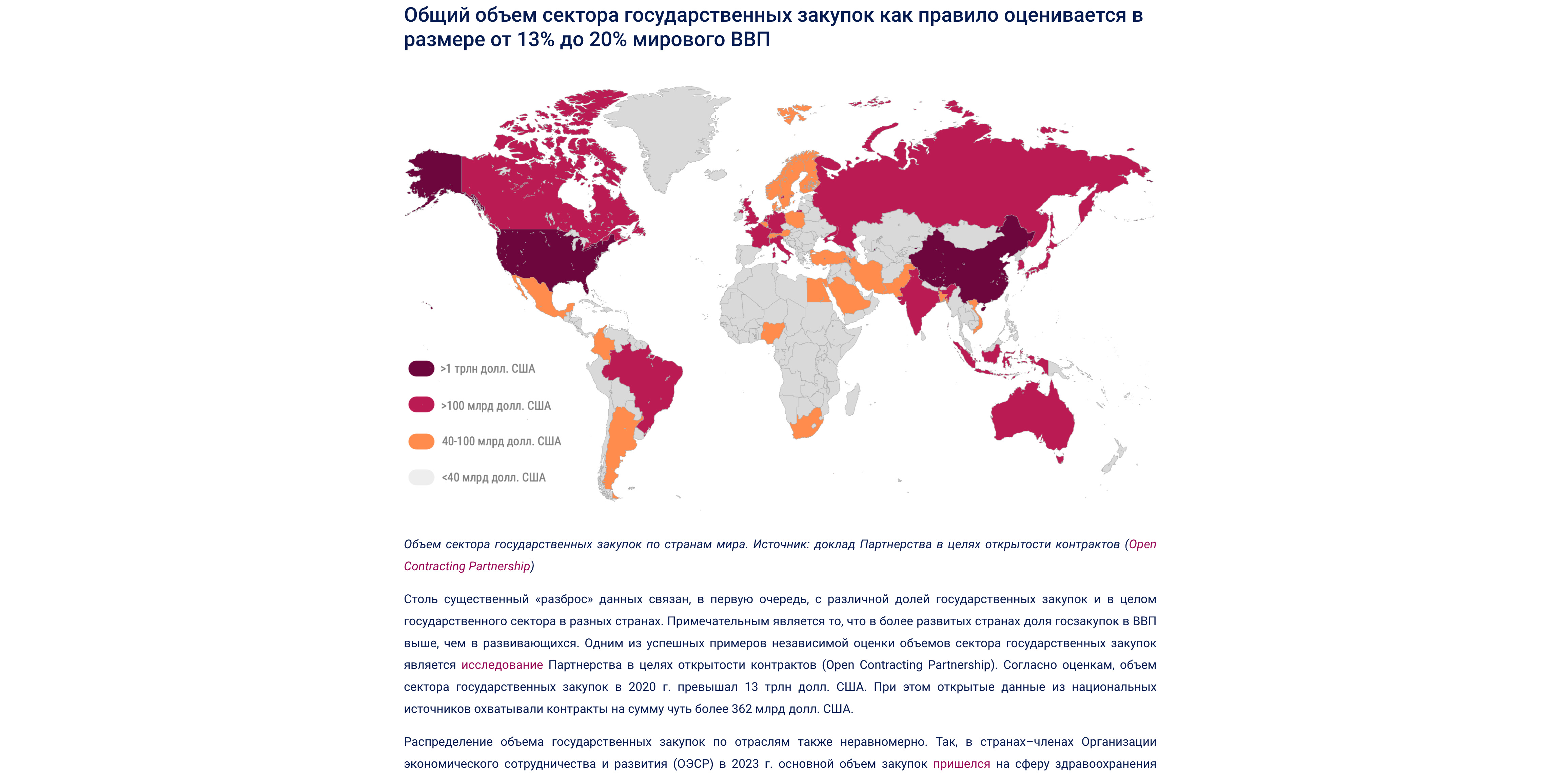 В задачу проекта входило интерактивно и наглядно представить обзор глобального сектора государственных закупок, основные принципы и подходы к регулированию закупок. В основу сборника легли материалы международных организаций, в частности Комиссии Организации Объединенных Наций по праву международной торговли (UNCITRAL), Всемирной торговой организации (ВТО), Всемирного банка, Организации экономического сотрудничества и развития (ОЭСР), Международной организации высших органов аудита (ИНТОСАИ), Европейского союза (ЕС) и Евразийского экономического союза (ЕАЭС).