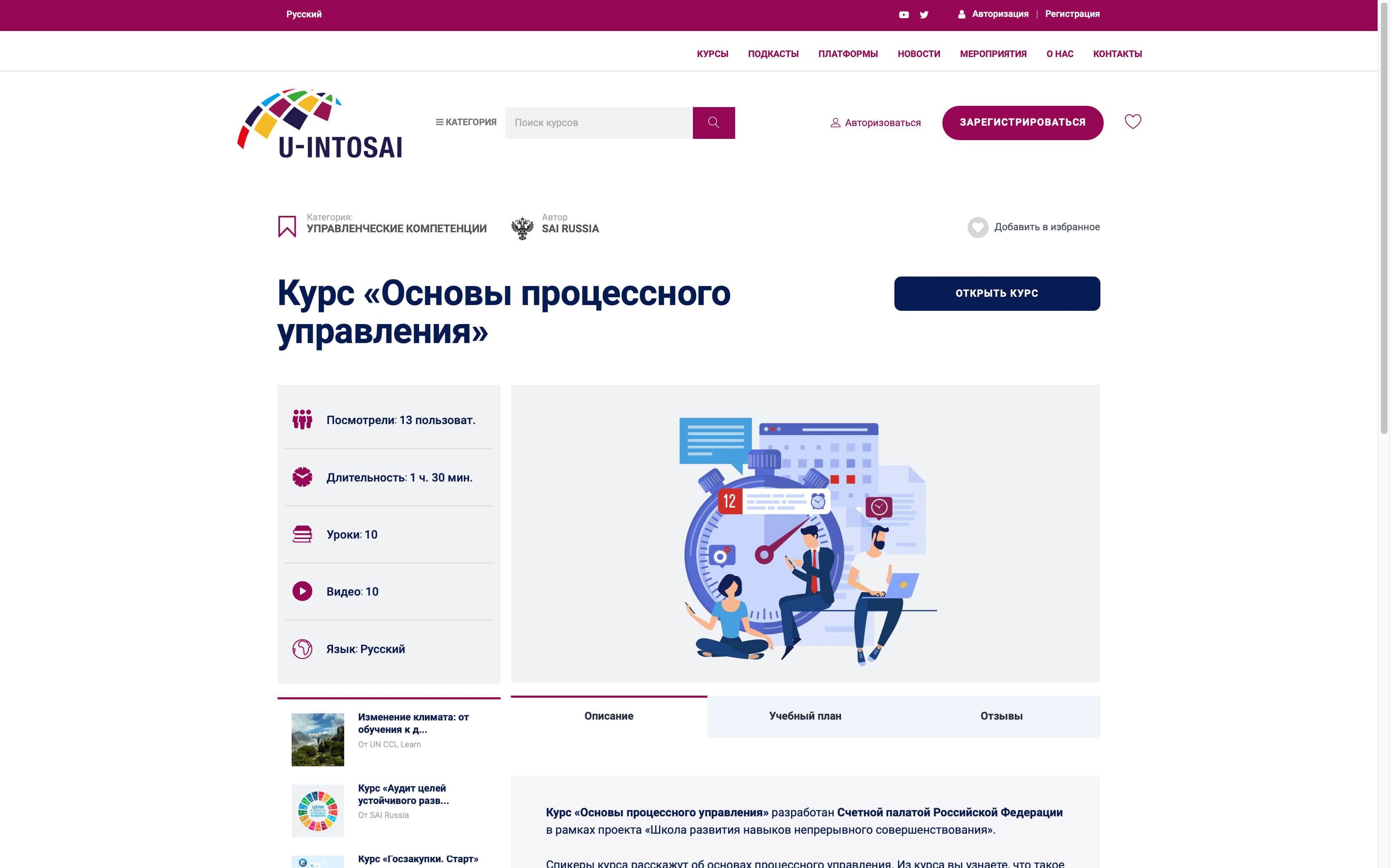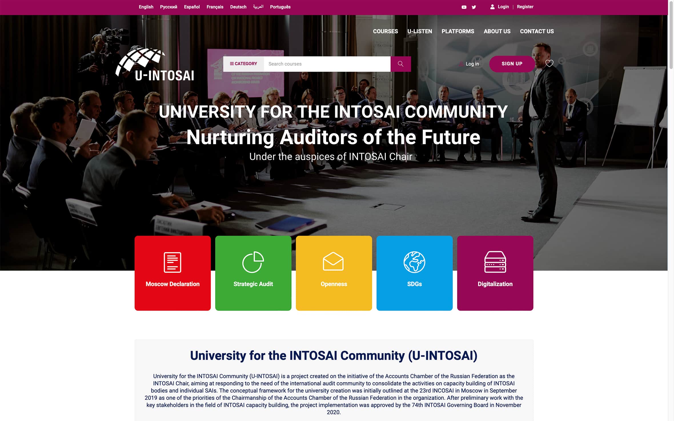 U-INTOSAI – Цифровой Университет для сообщества ИНТОСАИ – международная многоязычная образовательная онлайн-платформа для членов Международной организации ИНТОСАИ, созданная как уникальное пространство для обмена опытом и передовыми знаниями. Проект направлен на удовлетворение потребностей международного аудиторского сообщества в консолидации деятельности по наращиванию потенциала органов ИНТОСАИ и отдельных Высших органов аудита.